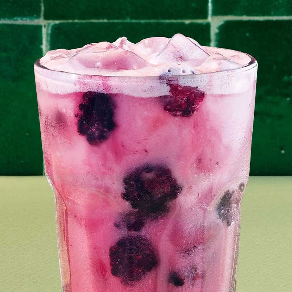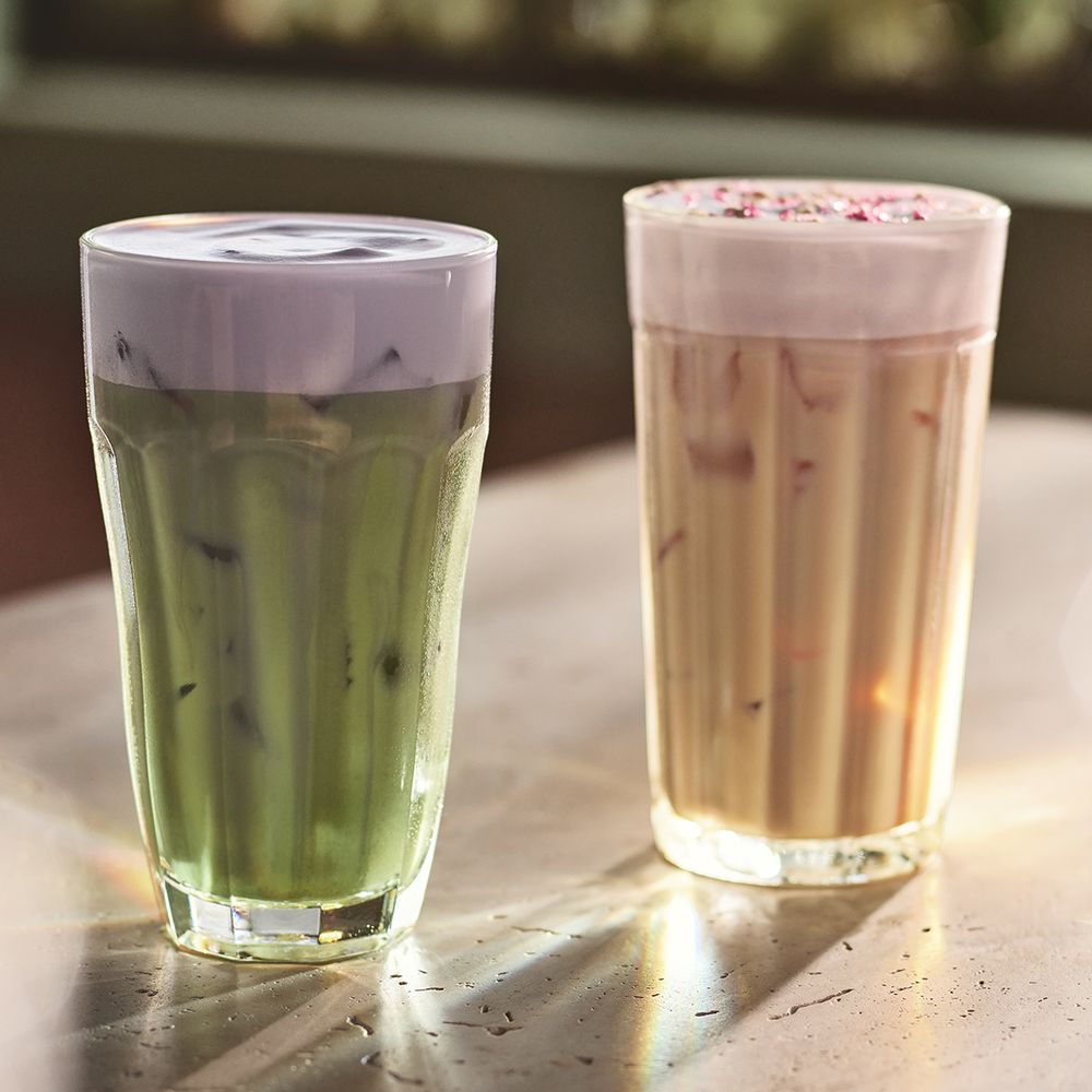An Iced Chai Latte topped with a creamy cold foam with notes of cherry and a crunchy topping for a springtime twist on a favorite.